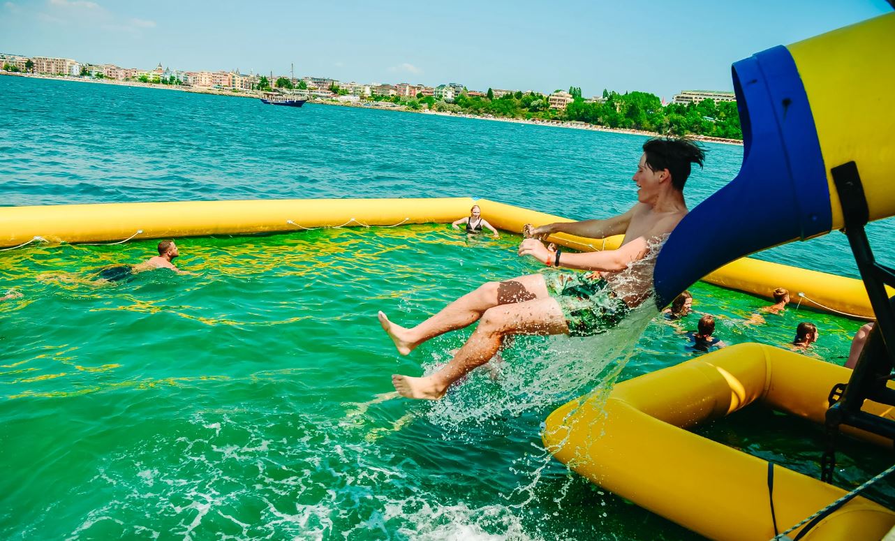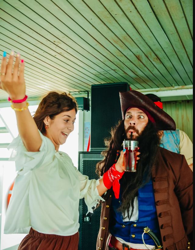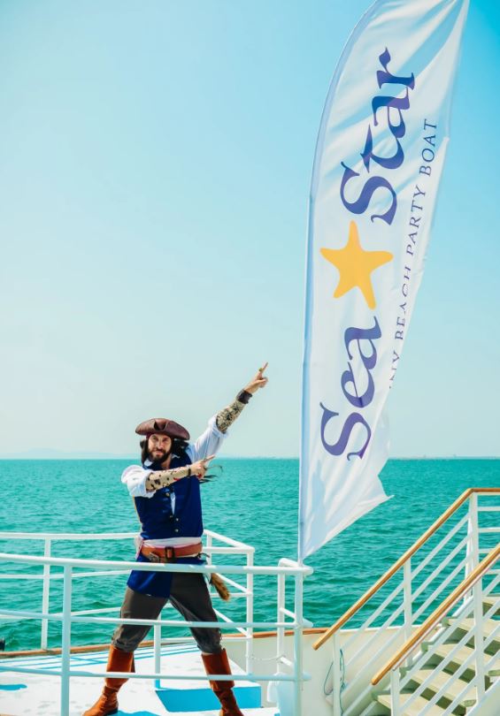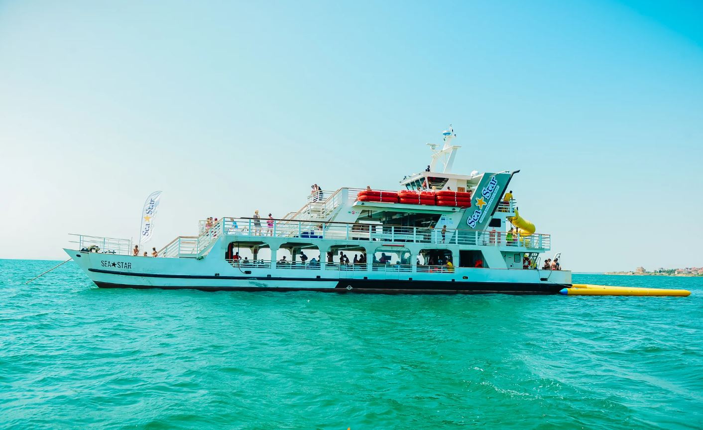 09:30 Отплаване с Катамаран Sea Star. Среща с пиратите . Богата анимационна програма. Катамарана плава бавно по крайбрежието на Сл.бряг и хвърля котва. Къпане в морето, водна пързалка на борда. Обяд и напитки на кораба .