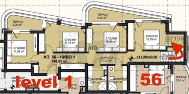 1 ниво – коридор, две бани с тоалетни, четири спални и два балкона.