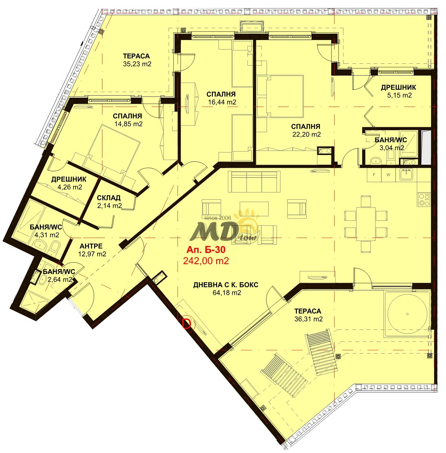 Разпределение: 3 спални, 3 бани, 65м2 хол, 2 големи тераси